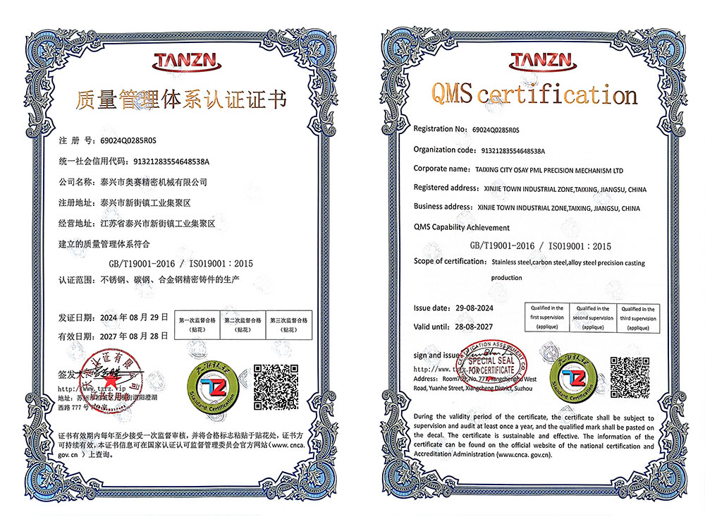 無錫奧賽精密機(jī)械制造有限公司是一家集熔模鑄造(也稱為硅溶膠鑄造和失蠟鑄造)、精密機(jī)械加工為一體的外貿(mào)出口型生產(chǎn)企業(yè),公司于2008年因其精密鑄造和機(jī)加工分廠的發(fā)展需要在無錫新區(qū)建立的,并于2011年在泰興市新街鎮(zhèn)建立了——泰興市奧賽精密機(jī)械有限公司,2018年在河南永城市建立了——永城市奧賽精密機(jī)械制造有限公司兩個(gè)生產(chǎn)基地。其中泰興奧賽生產(chǎn)建筑面積7000多平方米,永城奧賽生產(chǎn)建筑面積11000多平方米。 兩個(gè)生產(chǎn)基地同時(shí)都配有硅溶膠工藝的精密鑄造和精密機(jī)械加工兩個(gè)生產(chǎn)車間,來完成客戶對精密成品的需求。